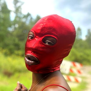 A captivating model in a red mask and red outfit, exuding a bold and fashionable vibe. OnlyFans content creator from the USA.