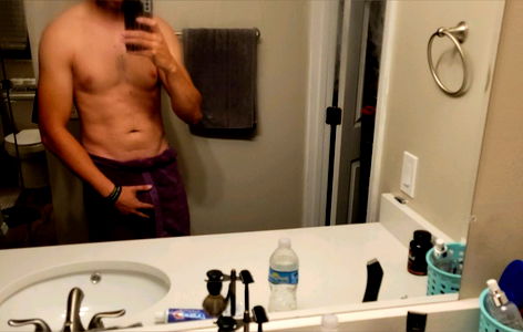 A young male model takes a mirror selfie, showcasing his athletic build and no-shirt look.