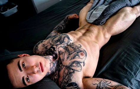 This image features a man showcasing his physical strength and artistic expressions in an indoor setting. He is positioned against a wall, his muscular, bare chest is exposed, revealing a detailed, ink-filled tattoo. The markings stretch across his flesh, moving with the contours of his well-defined muscles, suggesting he's no stranger to physical exertion. His elbow is visible, indicating he may be flexing or posing in a way to display his body and the inked artwork on it. His face, partially obscured by a rugged beard, indicates maturity and a sense of stoicism, adding to the overall ruggedness of the image. The environment appears to be well-lit, enhancing the visibility of his tattoo and emphasizing the textures of his skin and beard. This intimate portrait of a tattooed, muscular man highlights not just his physical prowess but also his personal, artistic expressions.