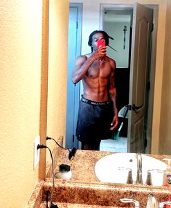 The image shows a well-built individual, possibly an OnlyFans model named ๐ฅท๐, standing confidently in a mirror with their phone out, taking a selfie. The person is in a room that appears to be a bathroom or dressing area, given the presence of a sink and other personal items in the background. The individual seems to be flexing their physique, showcasing their fitness efforts.