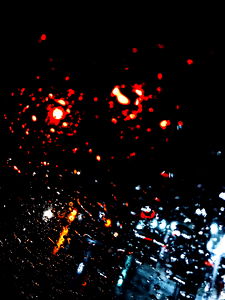 The photo captures a melancholic night in the city, with raindrops glistening on the lens and neon lights casting an ethereal glow. The blurred background suggests movement and adds to the overall mood.