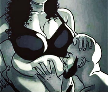 The image is an artistic representation of a model in a dynamic pose, wearing a bra and interacting with another figure. The art style appears to be reminiscent of comic books or graphic novels, emphasizing contrast and highlighting the subjects. There are no visible texts on the artwork.