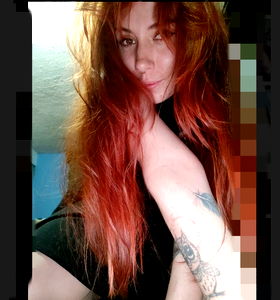 A young adult female with striking red hair, tattoos, and a passion for skateboarding. Her image captures her in a moment of casual style, leaning against a wall and looking directly at the camera.