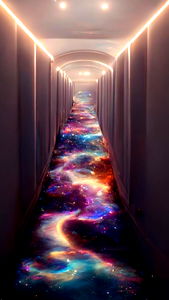 This image showcases an innovative hallway design, featuring a vibrant cosmic carpet that stretches the length of the corridor. The carpet's intricate patterns and vivid colors evoke a sense of wonder and exploration, making the hallway not just a passageway, but a creative statement piece.