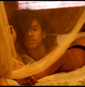 Jesse Jones, a model from Louisiana, is captured in an intimate pose. The room has a romantic ambiance with a canopy bed and a window with white curtains. Dressed in a simple white dress, Jesse poses with their hair cascading down their shoulders.