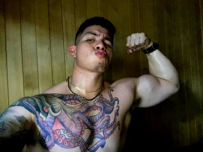 This picture features a young man, approximately in his early twenties, in an indoor setting. The main focus is on the man's muscular upper body, particularly his chest and shoulder area. His body is turned slightly, giving us a partial view of his back. Adding to his rugged appeal, there's a noticeable tattoo adorning his skin. The tattoo appears to be quite intricate, covering a significant portion of his exposed skin, although it's hard to decipher the exact design from this perspective. His face is also clearly visible in the image, showcasing well-defined facial features. He has a strong jawline and his eyes seem to hold a gentle intensity. His wrist is also visible in the picture, adding to the overall impression of a physically strong individual. The background is rather simple, dominated by a plain wall. The simplicity of the background ensures that the viewer's attention remains primarily on the man. The lighting in the room accentuates the man's muscles and the tattoo, creating an overall dramatic and intriguing effect.