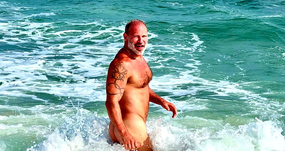 This vibrant image captures a lively outdoor scene, seemingly from a summer vacation. It's a splendid day at the beach where the powerful, yet beautiful waves of the water play a prominent role. The focus of the image is a barechested man, who appears to be in his early 60s. He's donning swimwear, indicating that he's ready to take on the sport of swimming. His face, showing signs of aging yet filled with enthusiasm, is turned towards the camera, suggesting he may be interacting with someone or perhaps posing for the photo. The man's attire and location suggest that he is there to enjoy the water, and possibly engage in some recreational swimming. His barechested appearance and swimwear hint at the warm weather, perfect for a day out in the water. This image beautifully encapsulates the essence of summer, outdoor activities, and a zest for life at any age. It radiates the joy of spending time in nature, the thrill of physical activity, and the charm of a seaside escape.