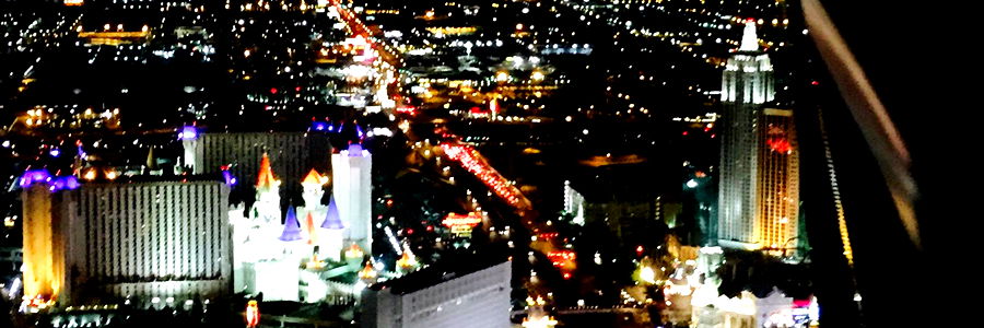 Overlooking the glittering lights of a bustling city, a nighttime image captures the illuminated skyscrapers and casino establishments, set against the darkened backdrop of the night sky. The scene offers a sense of excitement and energy, characteristic of vibrant urban centers. It's a moment frozen in time, as the city sleeps and wakes, with the lights continuing to shine brightly.