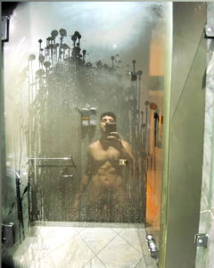 A proud and fit model in a private setting, with a confident pose and tattoos, showcasing his physique.