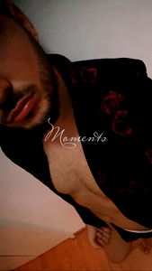 Photograph of a shirtless man wearing makeup and a black robe with red floral details. The model is standing in a room with white walls and a wooden floor. The photo has the text 'Memoirs' overlaid on the image.