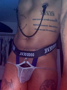 A shirtless selfie of a young man with tattoos, glasses, and earphones. He appears to be in a playful or casual mood.
