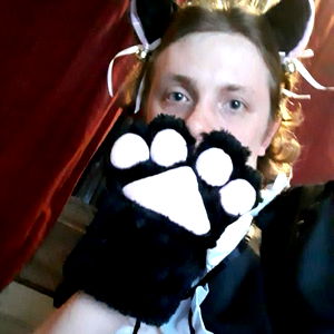 A fun and whimsical photo of a person wearing cat ears, holding a stuffed animal paw, and wearing claw gloves. The individual has their face partially obscured by the cat ears, adding to the playful theme.
