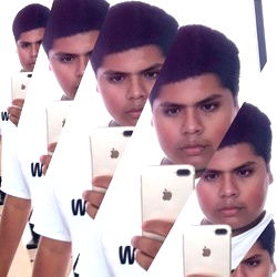 An OnlyFans model taking a selfie in front of the mirror. The image shows six different reflections with various expressions and poses, suggesting a creative and multifaceted personality. Jay is seen using an iPhone to capture this moment. In the background, there's a white textured wall which serves as a minimalist backdrop for the selfie series.