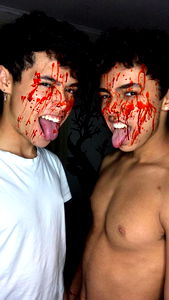 Model duo, Jose and Pedro, bring a playful energy to their photoshoot. They appear to be enjoying themselves amidst the splatter of red substance. The setting is casual with a pop of color on the wall. It's clear they are comfortable in front of the camera. Fans will appreciate this lighthearted moment.