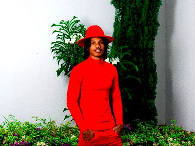 Model Joshmegans poses confidently against a wall, wearing a vibrant red turtleneck. His pose suggests a casual yet fashionable style.