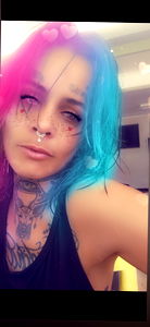 An Onlyfans model with vibrant hair and a visible tattoo, wearing a tank top. She's striking a pose in what appears to be an indoor setting.