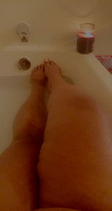 See Juicccy's bare feet in her own home setting. She is seated on a sofa with black nails and manicured toes, showcasing her foot care routine.