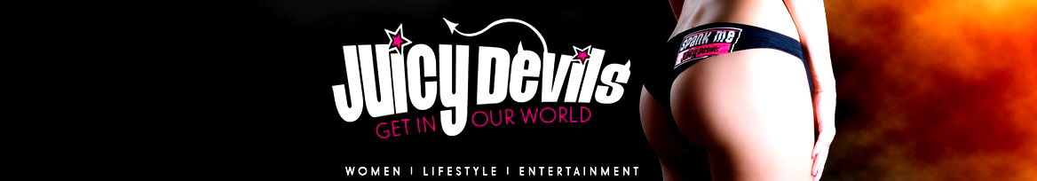 Model name Juicy Devils, from OnlyFans platform. Sharp contrast with black background and pink devil graphic.