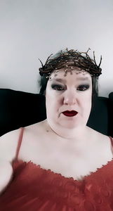 This image captures a candid and intimate moment of a woman, who appears to be in her late 40s or early 50s. She is seated in what seems to be an indoor setting with a cozy atmosphere. The lighting suggests it might be evening or nighttime. Her eyes are closed, indicating she may be relaxed or possibly lost in thought. The woman's expression conveys a sense of contentment. There are no visible texts or distinguishing marks that would provide further context.