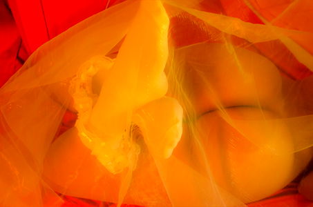 An intimate portrait of July Vaya, a Berlin-based OnlyFans model, in a candid moment. This image captures her unique style and allure. She is set against a vibrant red background with a yellow curtain adding depth to the composition. The image is a testament to her creativity and individuality.