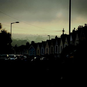 A serene morning scene with a view of colorful houses and streetlights along a quiet road, under a soft, foggy light.