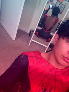 Young individual posing as Spiderman in a mirror. They are dressed in a full costume with the iconic red and blue suit, muscular physique, and are taking a selfie.