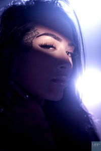 This image captures a close-up portrait of a young woman, dominating the frame with her visually arresting presence. Her face, the focal point of the portrait, is captured in sharp detail, revealing distinct features such as her well-shaped eyebrows and long eyelashes that frame her eyes. Her lips, too, are clearly visible, adding to the overall expressiveness of her countenance. The portrait appears to have been taken in a studio setting, as suggested by the lack of landmarks or notable background elements. The lighting used in the picture seems to accentuate the woman's features, casting her face in a soft glow while leaving the background in relative darkness. This creates a stark contrast that draws attention to her face, making her the indisputable subject of the photograph. Though the image is a still, it conveys a sense of intimacy and immediacy, as if the viewer is sharing a private moment with the woman. It's a classic example of portrait photography, using light and shadow to reveal the subject's personality and mood. The fact that it could be mistaken for a screenshot suggests a cinematic quality to the image, a testament to the photographer's skill.