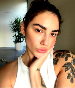 A young adult woman with visible tattoos. She has a neutral expression and is wearing makeup with accentuated eyeliner and mascara. Her hair is styled in a casual updo, and she is posing with one hand on her face, near her nose. The background is an indoor setting with plants and a white door frame.