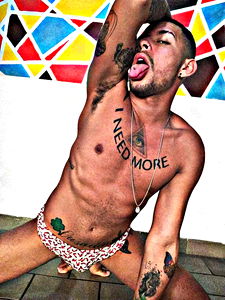 In this captivating model photo, Kayo Steinert is seen taking a break from his tattoo removal journey. He is seated on the edge of a sink in a bathroom, with a slight smile playing on his lips. His gaze seems to be directed at something off camera, adding an air of mystery to the scene. The simplicity of the bathroom setting contrasts with the intricacy of the tattoos adorning his arms and neck, hinting at his adventurous spirit. As he takes in the watermark of his tattoo removal process, we can't help but wonder about the stories behind each ink on his skin.