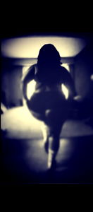 A black and white image capturing the essence of the beach at Myrtle. The contrast between the dark background and the subject adds a dramatic effect. A solitary figure is seen in motion, perhaps dancing or exercising on the boardwalk. The image exudes a sense of freedom and relaxation, typical of a beach destination.