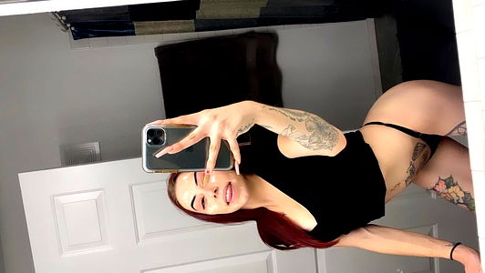An OnlyFans model posing in a mirror with a confident and seductive expression. She's wearing black lingerie and appears to be in her early twenties.