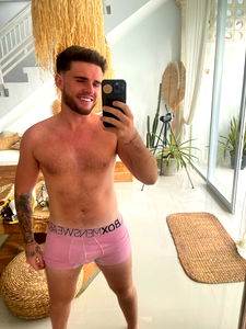 This high-resolution image captures a young man in his late twenties in an indoor setting. The focus of the image is predominantly on his upper body, which is bared to the viewer. His physique is noticeably muscular, suggesting that he maintains a regular fitness routine. He's not wearing a shirt, leaving his chest and abdominal muscles exposed, giving an impression of strength and discipline. The man is wearing a pair of shorts or underpants, possibly briefs, as his lower garment. There's no indication of the material, but it's an undergarment typically worn by men. His posture against the wall adds a casual, relaxed feel to the image. The wall in the background is plain, drawing more attention to the man's physique. Although the image doesn't reveal the entirety of his surroundings, it's clear that he's indoors. The lighting suggests an intimate, personal setting, perhaps a personal room or a backstage area.