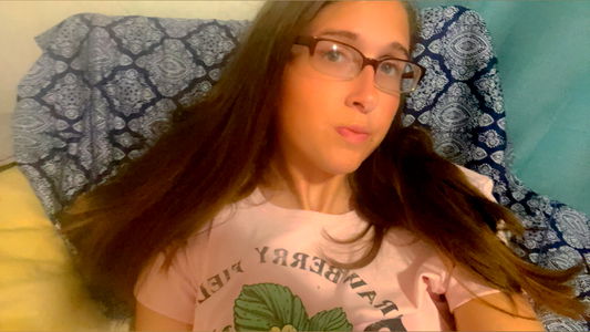 A young woman with glasses is seated on a bed, surrounded by a vivid purple glow. She has brown hair and is wearing a black top. Her facial expression suggests a moment of contemplation.