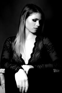 Key is a female-onlyfans model, known for her striking looks and lingerie fashion sense. In this image, she's posed in a seductive manner with a monochrome color scheme that emphasizes her attire and the mood of the photo.