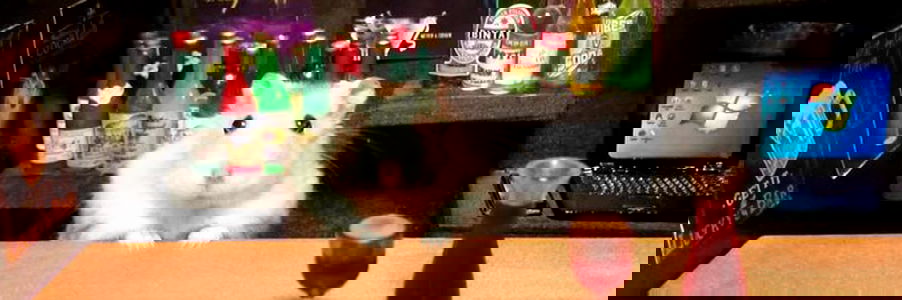 Kim Kely is a model captured in a lively bar setting. She is sitting at a counter, holding a wine glass, and looking directly at the camera. The background is bustling with various bottles of alcohol, a laptop, and a TV displaying colorful images. Kim appears to be in her mid-20s, dressed casually yet stylishly, with a modern and fashionable vibe.