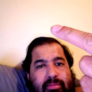 A man with a beard in the foreground is pointing his finger directly at the camera. He has a casual expression and is indoors, possibly on a couch or similar surface. The lighting suggests it's evening or night time.