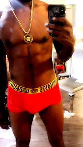 The image features a male fitness model from Los Angeles, California. The man is shirtless and wearing red underwear with a visible gold chain necklace. He has his arms flexed, emphasizing his physique. The photo captures him in a casual yet confident pose, showcasing his well-defined muscles. The background is minimalistic, focusing attention on the model.