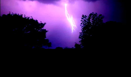 The image captures a powerful and dramatic storm, with a mesmerizing purple lightning that illuminates the dark sky. The scene is set in what appears to be a rural area at night, with trees barely visible against the tumultuous backdrop of the storm. The lighting creates a striking contrast between the bright flashes of the lightning and the deep shadows of the night-time surroundings. This image truly conveys the raw power and beauty of nature.