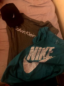 The image showcases a collection of athletic wear including a Calvin Klein shirt, a Nike hat, and a Nike towel, neatly arranged on a bed with a gray backdrop. The ensemble reflects an interest in sportswear and accessories.