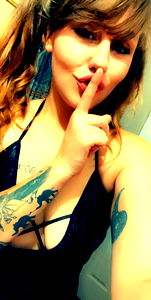 A young woman is captured in a candid moment, playfully posing with her finger to her lips. She's dressed in a black bodysuit, revealing visible tattoos on her arms. A selfie sticker is adhered to the back of her phone, adding a personal touch to the image. The blurred background suggests a casual, homey setting, possibly a cozy cafe or bedroom, indicative of the relaxed and intimate nature of such a photo.