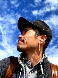 A male model from Japan, gazing into the distance with headphones. He is carrying a backpack and dressed in casual attire. This could be an advertisement for travel or fashion.
