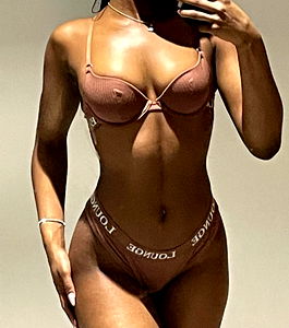 The image showcases the Onlyfans model Tia<3 in a revealing, light brown lingerie set. She is striking a pose for a photo, captured in mid-turn with her left hand on her hip and right arm extended outward. The setting appears to be an indoor room with neutral colors and ample lighting that highlights her figure and the delicate details of her outfit. She is also wearing a necklace and has her hair styled upwards.