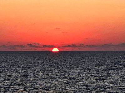 A breathtaking image of a vibrant sunset casting hues of orange and pink on the horizon above the ocean. The sky meets the sea at the horizon, creating an ethereal and serene atmosphere.