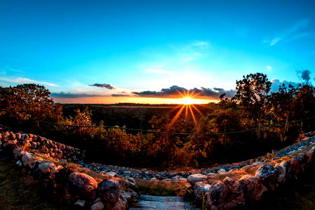 A picturesque sunset scene with a stone wall, set in the midst of a verdant forest. Laura's NYC photo showcases the warm hues of the sky, casting a soft light on the natural surroundings.