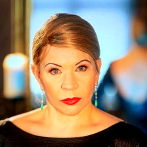 A poised and stylish woman poses for the camera, exuding confidence in her black dress. The dark background emphasizes her presence.