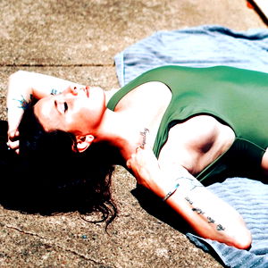 In this image, LunaBlue is captured in her natural habitat: a sunny beach. She sports a vibrant green tank top, accentuating her athletic physique, with tattoos peeking through on her upper arms. Her hair, styled in loose waves, frames her face as she gazes directly into the camera, exuding an air of confidence and poise.