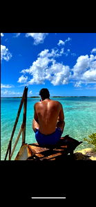 Model Logan Alexander sitting on a wooden bench overlooking turquoise waters, looking out at the sea with a contemplative expression.