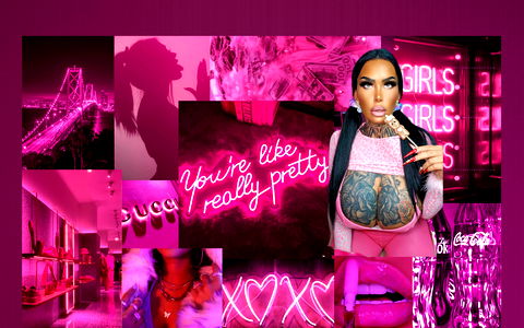 Sensational Onlyfans model Lana_ink poses in a vibrant, colorful outfit that accentuates her tattoos. With a playful expression, she stands confidently against a bright pink background, drawing attention to her unique style.