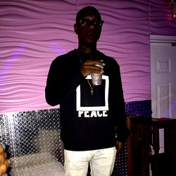 An image of a man named Launcelot standing in front of a pink wall and a textured wall, wearing glasses, a black sweatshirt with a peace sign design on it, and holding a drink. He is posing casually with one hand in his pocket and the other holding a cup. The environment suggests a party setting with dim lighting and a relaxed atmosphere.