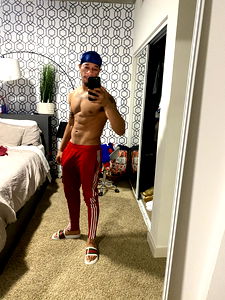 In the image, Onlyfans model Lashalln Lagarde is striking a pose for a mirror selfie. He is wearing a red tracksuit and a blue bandana. He holds a phone in his hand, which he might have used to take this photo. The room around him appears cozy with a couch visible in the background.